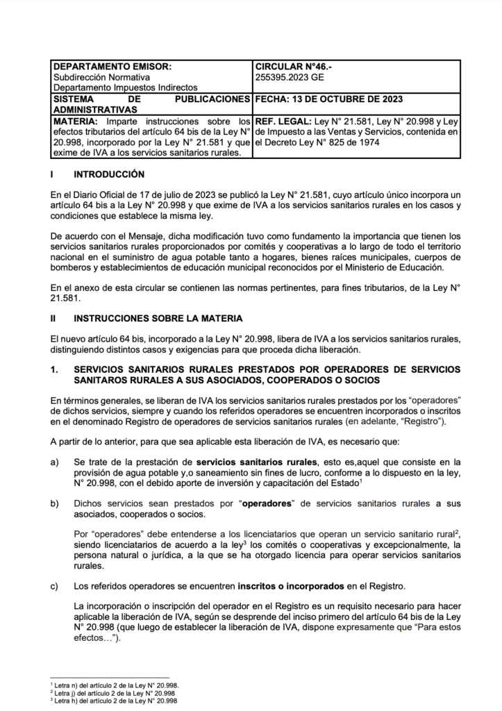 La Circular N°46 del Servicio de Impuestos Internos, emitida el 13 de octubre de 2023, dice relación con los efectos tributarios del artículo 64 bis de la Ley N° 20.998. Este artículo fue incorporado por la Ley N° 21.581 y en ciertos casos, exime del Impuesto al Valor Agregado (IVA) a los servicios sanitarios rurales.